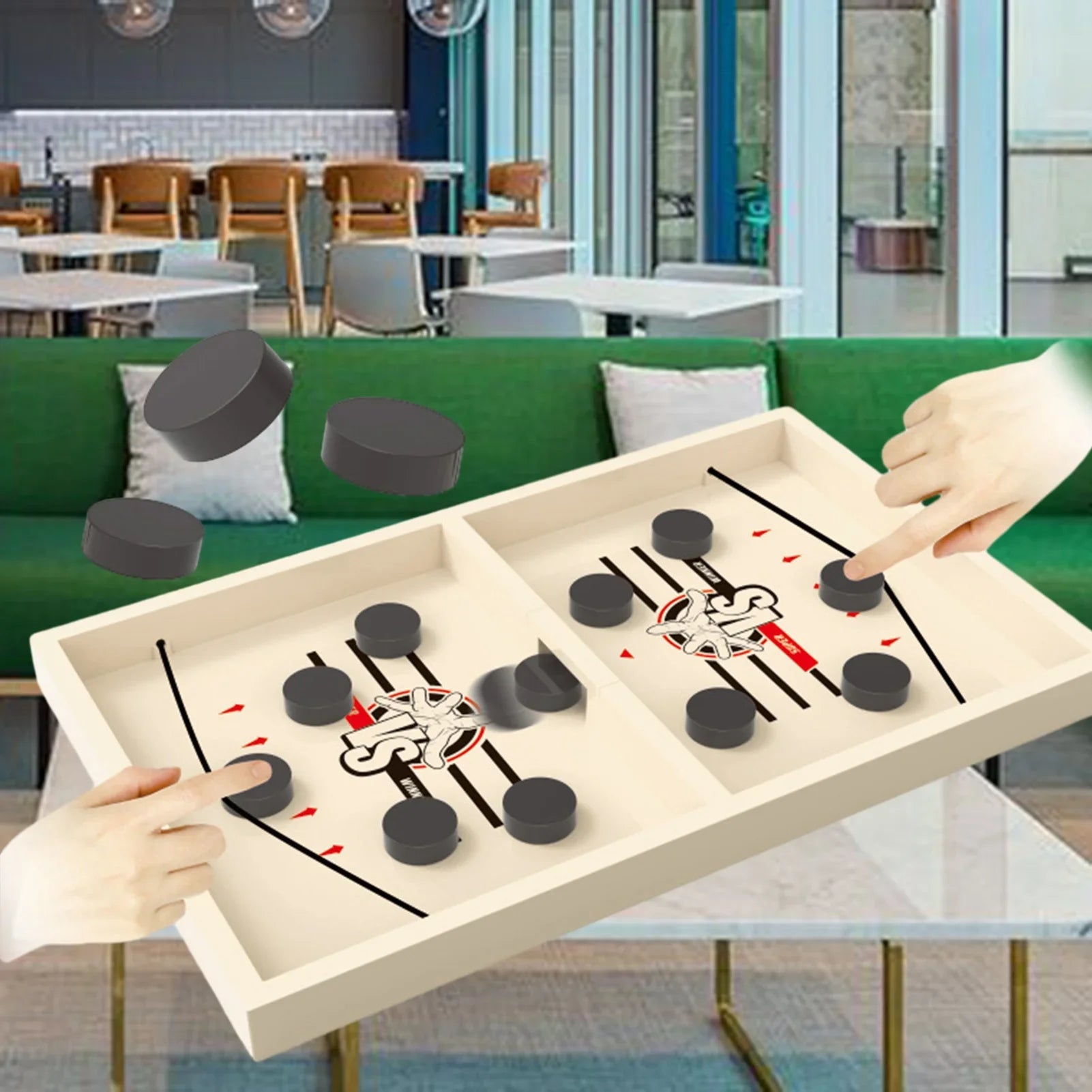 - Features two players and five pucks each, creating an engaging challenge to score while defending.